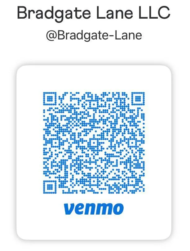Venmo - @Bradgate-Lane - Fees apply (1.9% on direct payments, 2.3% on Tap-to-Pay)